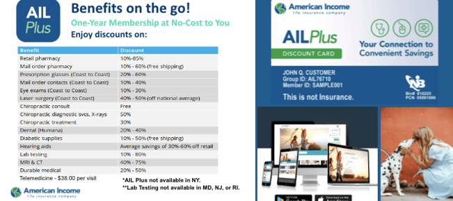 If you would like for me to give you a free quote, I would be happy to. I can also give you some no cost benefits such as our AIL Plus Discount card that gives you up to 85% off your health services, even if you have health insurance, A Child Safe App that lets you keep vital info on your children, grandchildren or even the elderly that you can easily transfer to the authorities should they go missing, an offer you a no cost $2000 Accidental Death and Dismemberment certificate just for sitting through an appointment with me.